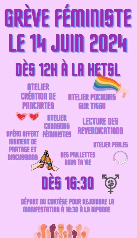 🔥13 JUIN 2024 🔥 💜 Viens lancer avec nous la journée de mobilisation du 14 juin !!!💥 Rendez-vous, à 21h, au parc de Milan pour une manifestation nocturne !🔥 On se retrouve après à Ouchy, viens mettre le le feu au patriarcat… Lire la suite : 14 juin 2024: Grève Féministe - Non à l’extension de l’ouverture des bars le 14 juin prochain